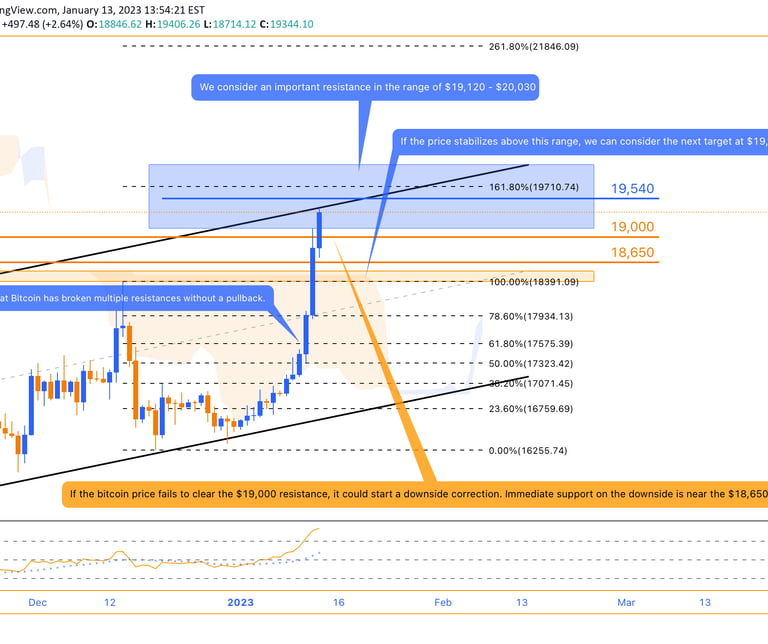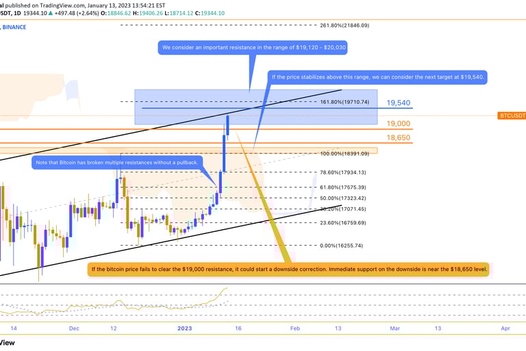 Yesterday, after forming a range zone below the $18,500 resistance, Bitcoin broke this resistance with more support from buyers. Higher ceilings and floors are now confirmed on the 4-hour timeframe, and we can consider a medium-term bullish channel for Bitcoin . The price of $19,000 is at the ceiling of this ascending channel , and Bitcoin has shown a negative reaction to this area. The strong resistance has been broken in the range of $18,390 to $18,530. If the price stabilizes above this range, we can consider the next target at $19,540. Note that Bitcoin has broken multiple resistances without a pullback. On the one hand, the willingness of sellers can increase, and on the other hand, there is a possibility of price return and pullback to its support levels. Note that more than 60% of the last strong bearish candle on the weekly time frame is covered by buying pressure. But for full coverage, the price needs to grow further to the price of 20,030 dollars. Therefore, we consider an important resistance in the range of $19,120 - $20,030. Bitcoin has reached both the channel ceiling resistance and this static range. So if a reaction is seen, and signs of a reversal appear on the chart, Bitcoin can correct towards its supports. If the bitcoin price fails to clear the $19,000 resistance, it could start a downside correction. Immediate support on the downside is near the $18,650 level.