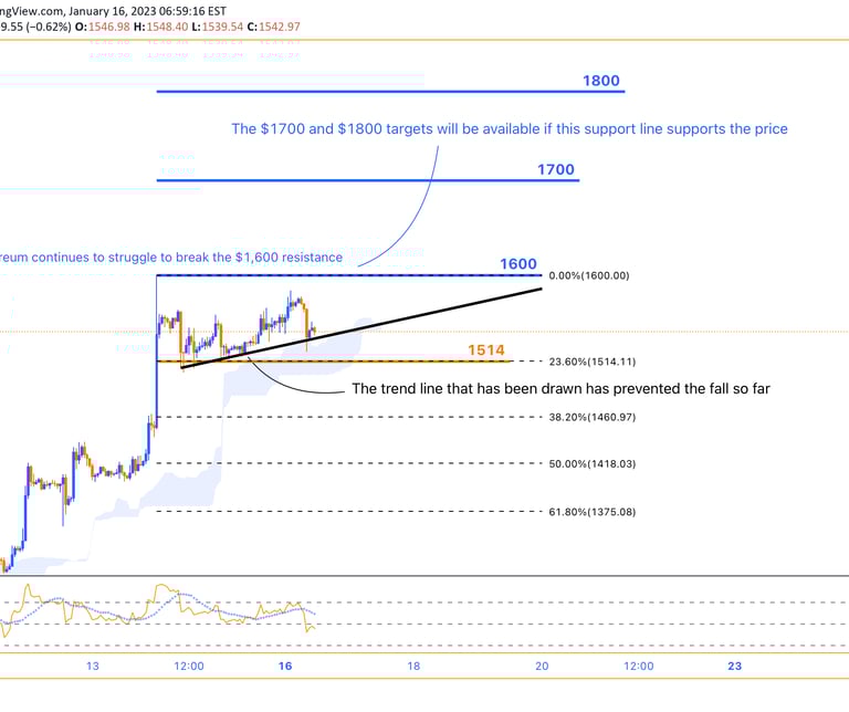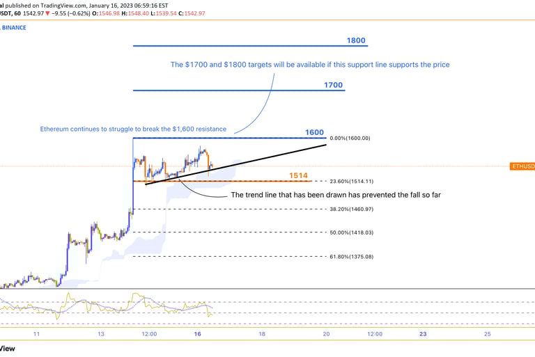 Ethereum continues to struggle to break the $1,600 resistance. If Bitcoin crosses its resistance range, Ethereum can also break this resistance. The trend line that has been drawn has prevented the fall so far. The $1700 and $1800 targets will be available if this support line supports the price. It is not recommended to enter the trade until the resistance of $1,600 or the trend line is broken.