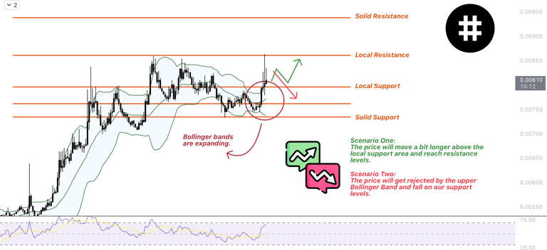 The price will get rejected by the upper Bollinger Band and fall on our support levels.