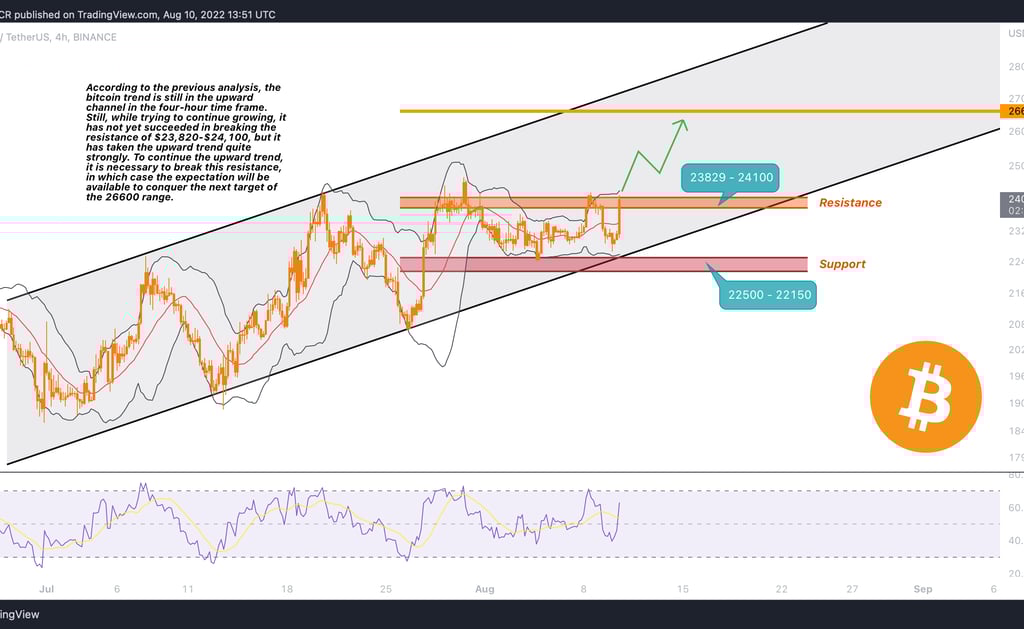 According to the previous analysis, the bitcoin trend is still in the upward channel in the four-hour time frame. Still, while trying to continue growing, it has not yet succeeded in breaking the resistance of $23,820-$24,100, but it has taken the upward trend quite strongly. To continue the upward trend, it is necessary to break this resistance, in which case the expectation will be available to conquer the next target of the 26600 range.