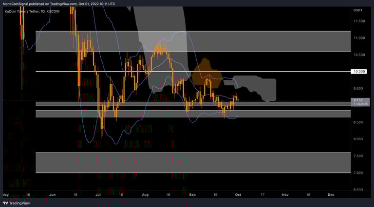 KCS had a nice price increase during the last week. After the price hit the support range of $8.85 to $8.65 and saw a positive reaction, we saw the price increase again. The resistance range of $9-$9.10 has again become support. Last week's candle of this currency is a Doji candle with a very small body, which is a good sign of the support range. This week, the new candle is above the previous candle's range, which can again be a good sign for possible price growth.