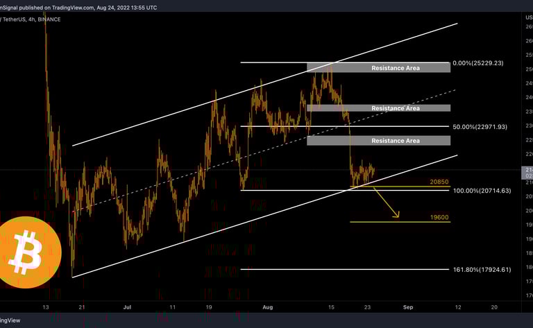 Confirm continued decline to the next range of $19,600, consolidation below $20,850.