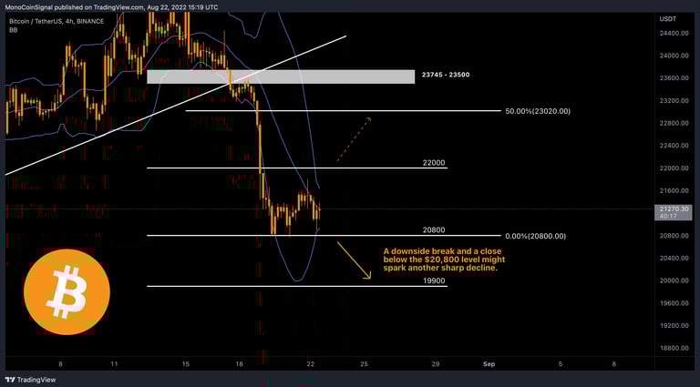 The next major support for BTC now is $20,800. A downside break and a close below the $20,800 level might spark another sharp decline. In the stated case, the price might decline towards $20,000 and, after that, $19,000.