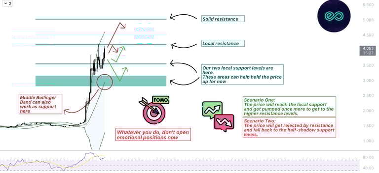 You should be aware of two resistance levels on the way up, two support levels on the way down, and also the middle Bollinger Band.