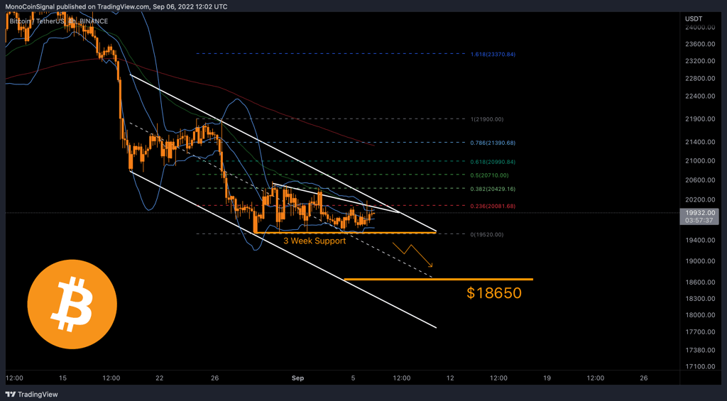 A breakout of the bottom of the pattern provides the expectation for continued decline to the next range of $18,650.