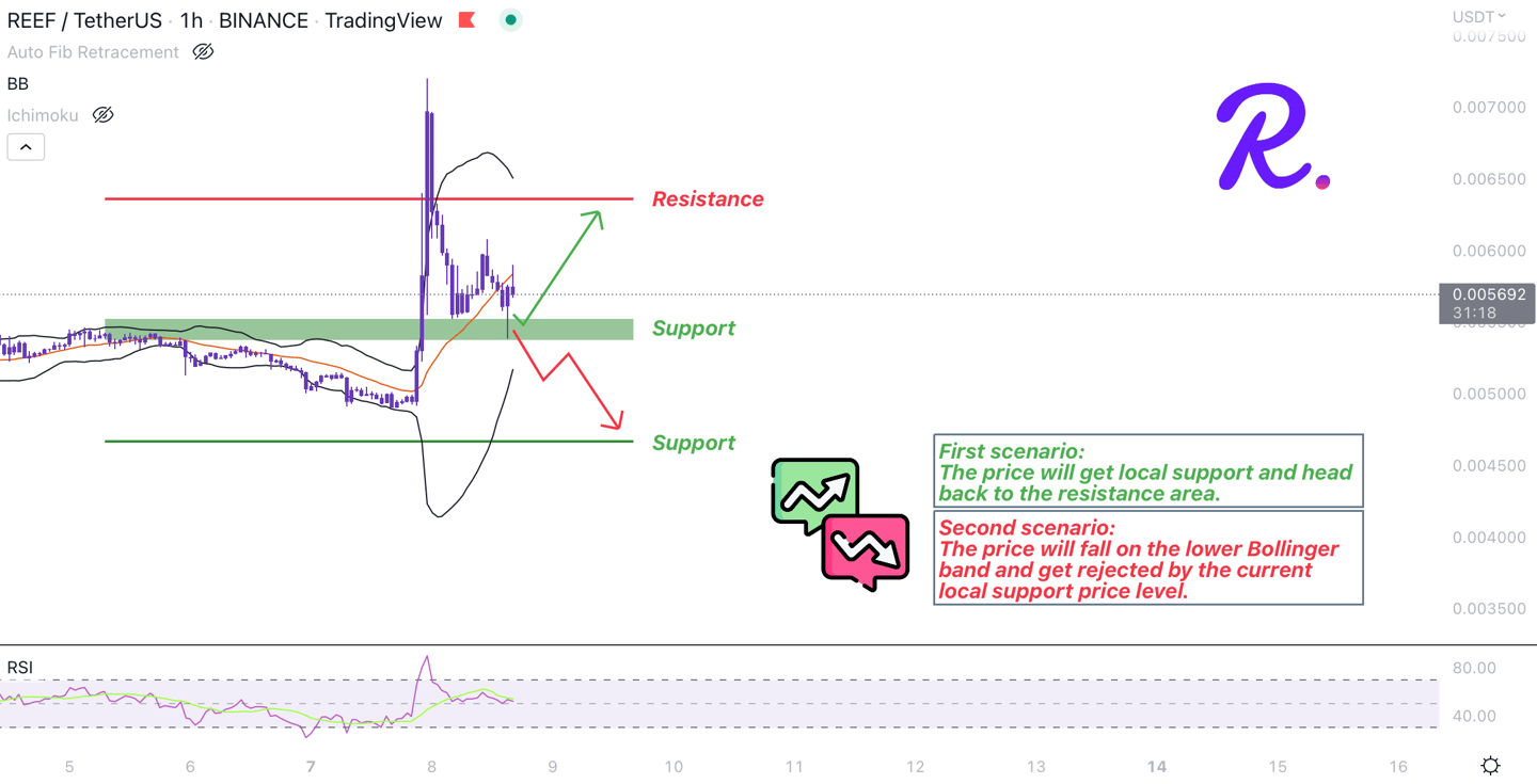 REEF just got rejected by the solid resistance and now got support from local support and the middle Bollinger band.