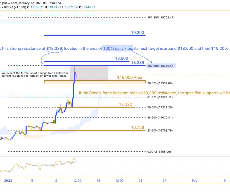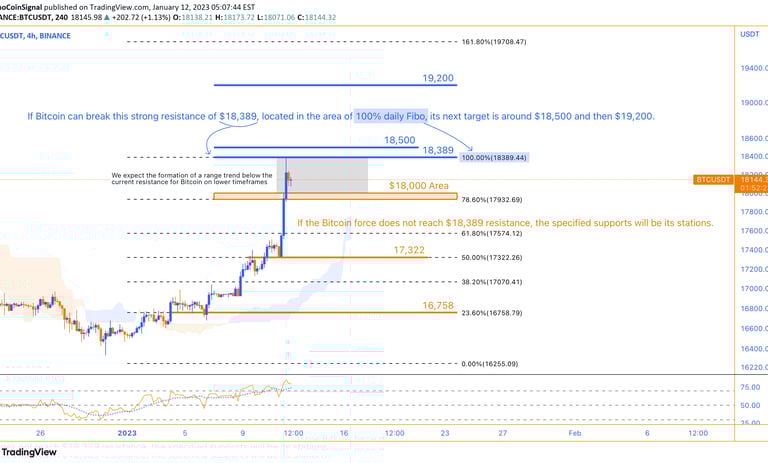 Bitcoin was supported the previous day by a retracement to the $17,322 range, which is the 50% Fibonacci retracement range, and rose to the resistance levels considered for it in the $18,000 range. The increase in the price of Bitcoin has continued until the previous ceiling in the range of 18,389 dollars. Resistance on the chart for the past seven months has much power to react. The important point is that in the daily time frame, the number of bullish candles and the shape of the candles are all signs of buying pressure. So this time, if there is an attempt to break the resistance of the previous ceiling and form a higher ceiling, we can get a strong signal for a trend change in the 4-hour time frame. For the short term and in the lower time frames, we expect the formation of a range trend below the current resistance for Bitcoin . If Bitcoin can break this strong resistance of $18,389, located in the area of 100% daily Fibo, its next target is around $18,500 and then $19,200. If the Bitcoin force does not reach this resistance, the specified supports will be its stations. Be sure to use risk and asset management in your trades.