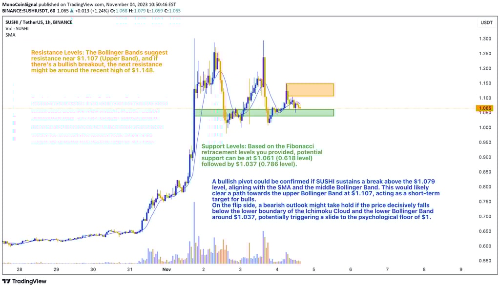 SUSHI's technical analysis presents a battleground at the $1.066 price level, with a mix of bullish and bearish signals. The proximity of the Simple Moving Average (SMA) and the middle Bollinger Band indicates a pivotal point for the pair, while the RSI and Stochastic Oscillator hint at potential for an upward move, tempered by the Parabolic SAR and Ichimoku Cloud which suggest caution.
