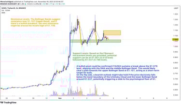 A bullish pivot could be confirmed if SUSHI sustains a break above the $1.079 level, aligning with the SMA and the middle Bollinger Band. This would likely clear a path towards the upper Bollinger Band at $1.107, acting as a short-term target for bulls.