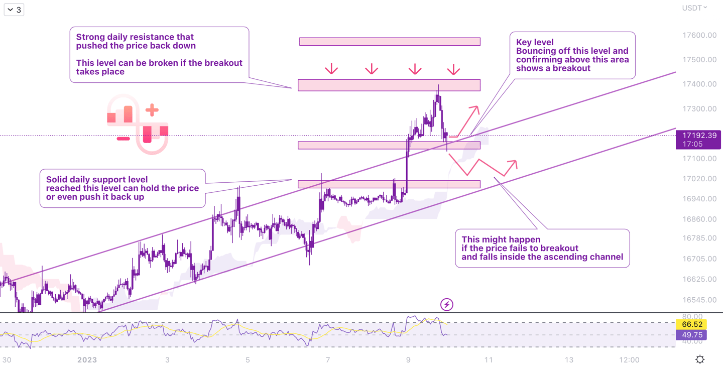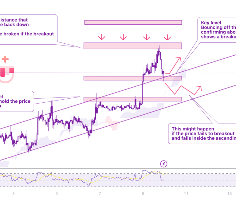 If the channel's upper band and the static support level hold and push the price back up, we can confirm this as a successful breakout.